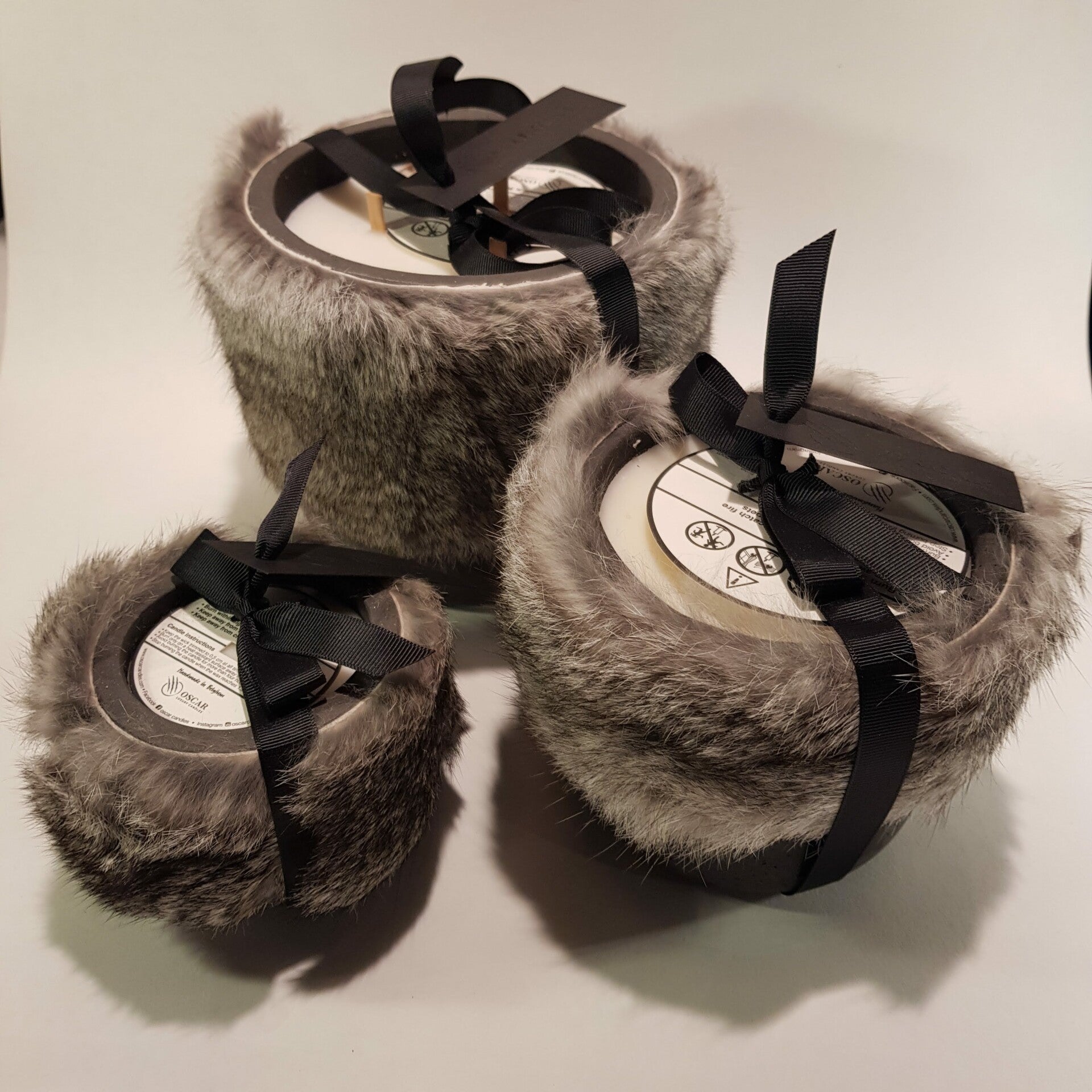Geurkaars in betonnen pot met konijnenvacht rondom