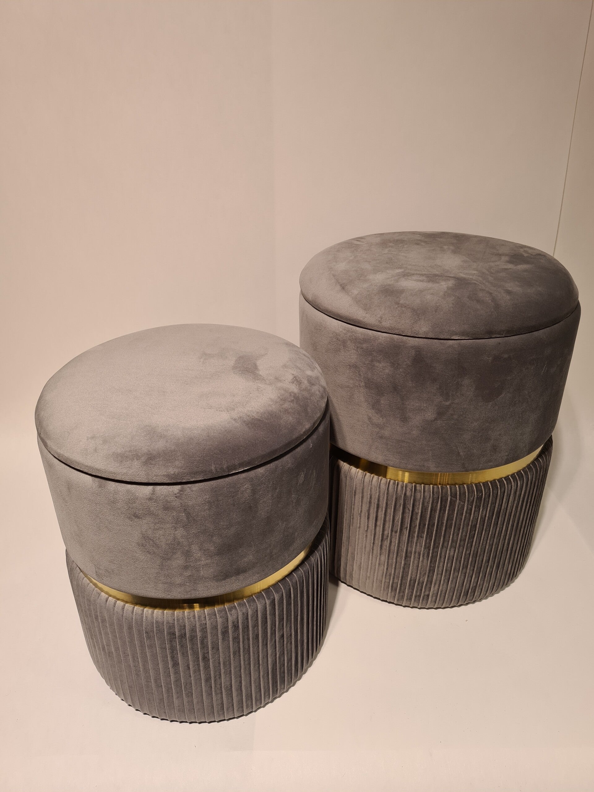Opbergpoef in grijs fluweel met goudkleurige band - set van 2
